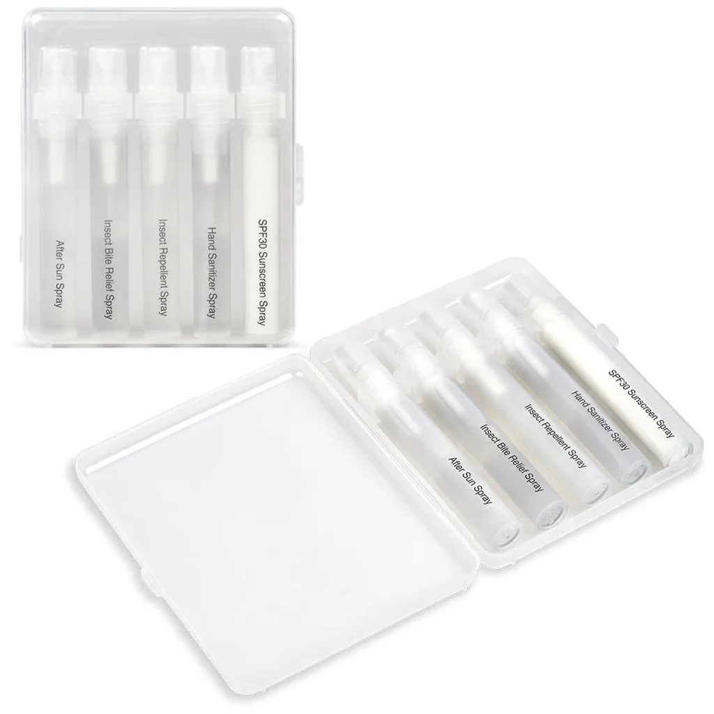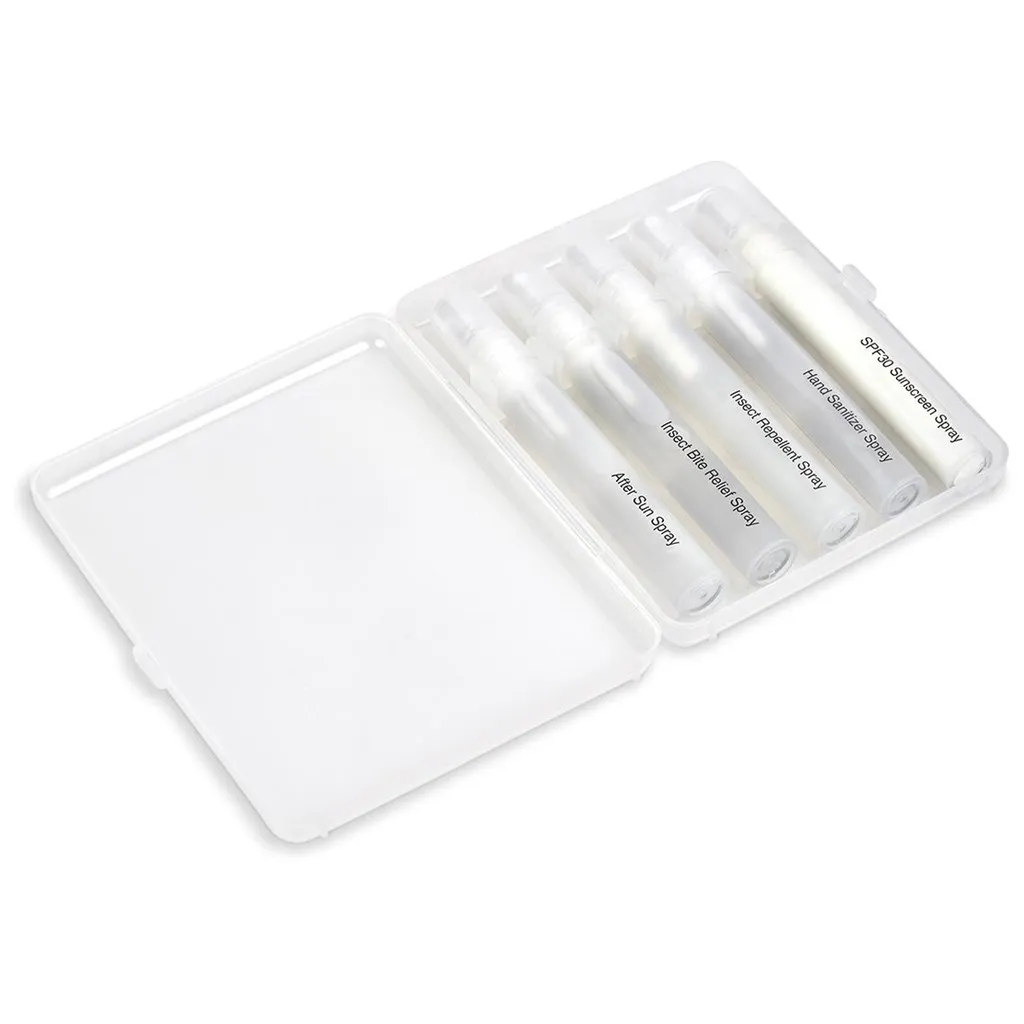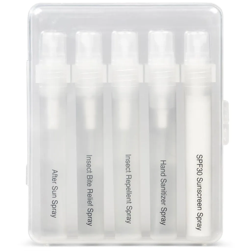 Take this clever and compact kit with you when travelling, camping, picnicking, or hiking. It features 5 useful sprays, securely packed together in a durable transparent case.