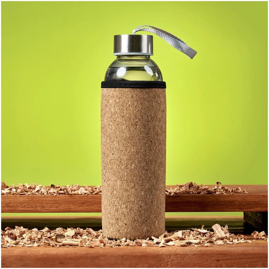glass bottle with natural cork laminated insulation sleeve