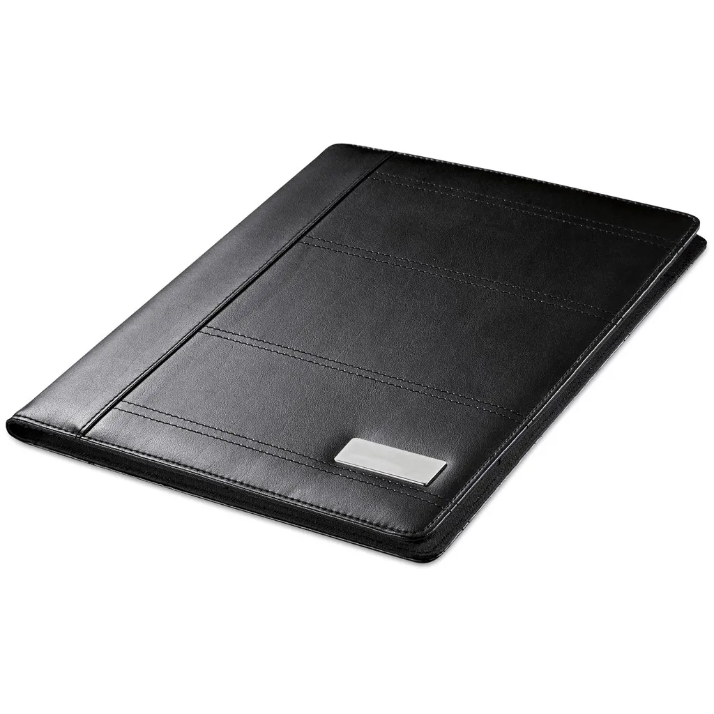 Made from a smooth black PU, with black stitching design, this folder features a metal plate for laser engraving of your logo.
